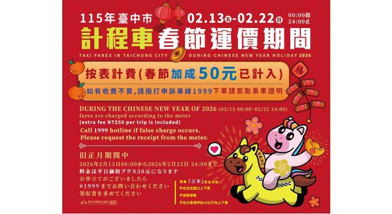 為體恤計程車駕駛春節持續投入第一線服務,台中市政府交通局宣布,自2月13日起至2月22日(大年初六)止,共計10日,中市計程車將實施春節加成費率,每趟次加收50元,2月23日00時起,全面恢復原收費方式。為讓國內外乘客了解春節費率規定,特別印製中、英、日3國語言收費說明貼紙,請計程車駕駛張貼於車內明顯處,共同提升整體服務品質與城市形象。