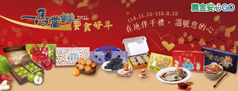 為迎接馬年的到來,農業金庫子公司農金資訊公司的「農金安心GO」嚴選各種優質年節農產品,農業金庫協助推廣,將金融服務面延伸至產銷面,促進農漁產業發展,期盼透過平台活動,讓民眾歡樂迎新辦年貨,優「鮮」過好年!