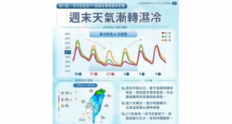 中央氣象署指出,今(31)日鋒面通過,中部以北及宜蘭地區降雨區域較廣,有短暫雨,花東地區、恆春半島及南部山區也有局部短暫雨,南部平地亦有零星降雨機會,外出請攜帶雨具備用;鋒面通過後,東北季風增強或大陸冷氣團南下,北部及宜蘭天氣轉涼。若溫度與水氣條件配合,今晚起至明後天(週日、週一)中部以北及宜蘭、花蓮3000公尺以上高山有零星降雪機率。