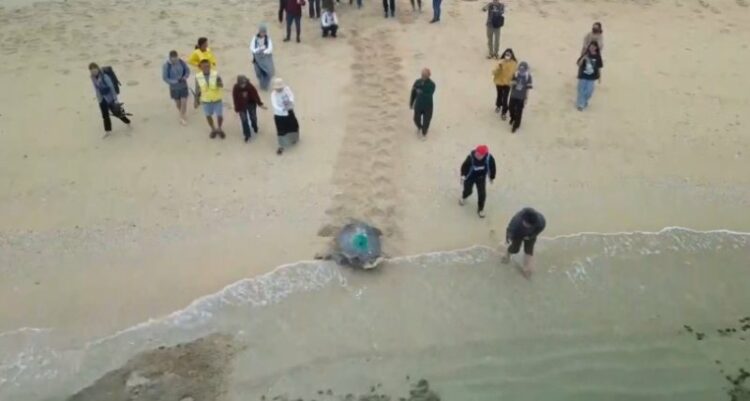 圖/海龜裝設衛星發報器,順利重返大海。(海保署提供)