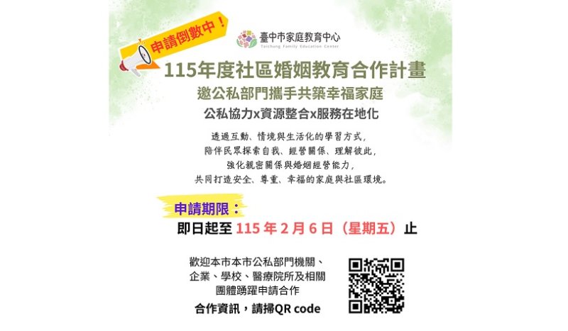 為深化婚姻教育向下扎根,協助市民提升親密關係與婚姻經營能力,台中市家庭教育中心推動「115年度社區婚姻教育合作計畫」,走入社區辦理多元、互動式推廣學習課程,打造貼近生活、可近且具支持力的婚姻教育服務網絡。家庭教育中心指出,目前計畫申請已進入倒數階段,誠摯邀請台中市各公私部門及相關團體踴躍提出申請,共同推動幸福家庭。