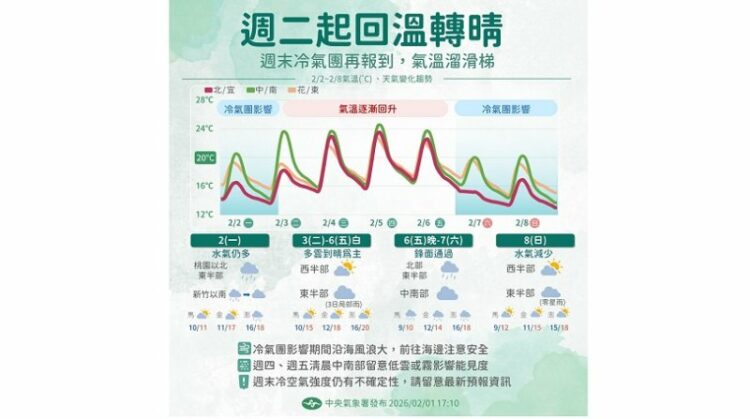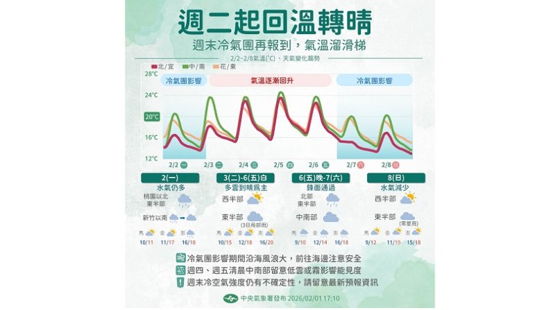 週二(3日)清晨大陸冷氣團持續影響,北部、東北部及東部天氣偏冷,東半部地區有局部短暫雨,基隆北海岸、恆春半島及大台北山區有零星短暫雨,其他地區為多雲到晴。週三(4日)至週五(6日)白天各地大多為多雲,中南部日夜溫差大,僅台東地區及恆春半島有零星短暫雨。