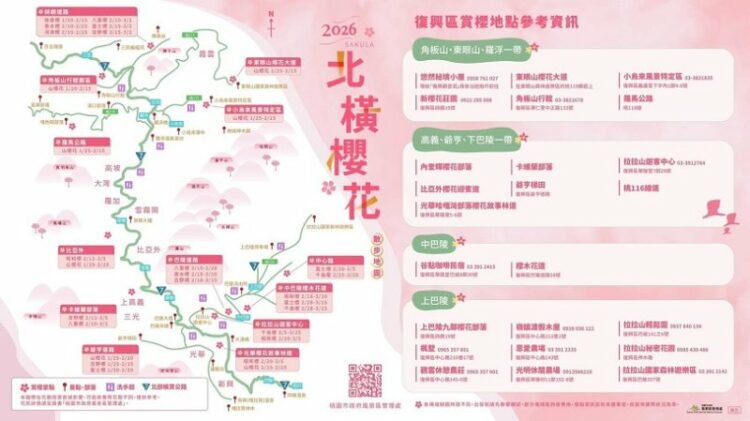 觀旅局陳靜芳局長指出,預計前往桃園市復興區巴陵地區一帶賞花的民眾,市府團隊參考歷年花況資訊,推出「2026北橫櫻花散步地圖」,想賞花的民眾可至「桃園市政府風景區管理處」或「探索北橫」粉絲專頁下載最新賞櫻地圖,此外,欲知道最新花況資訊者,可關注「桃園市政府風景區管理處」臉書粉專,自115年2月1日起每週更新最新櫻花花況資訊!