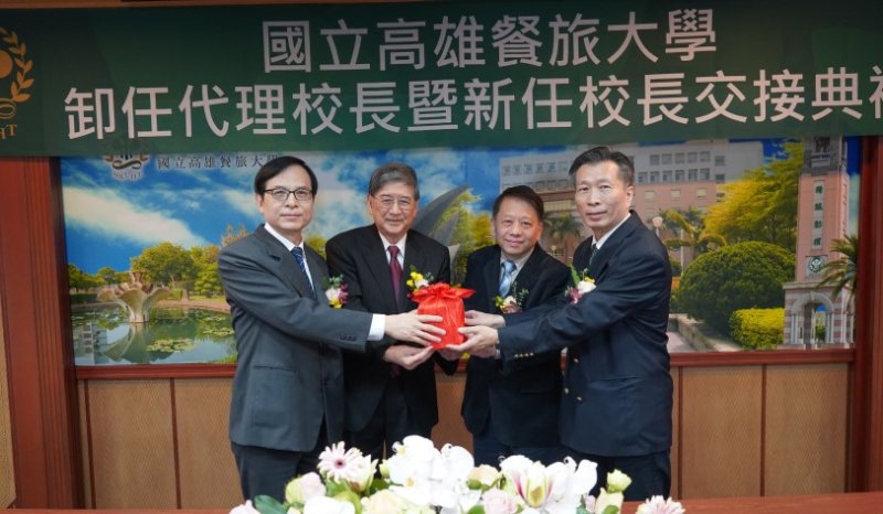 圖/高餐大前校長容繼業和陳敦基兩位博士見證下,方德隆校長(右1)從陳國泰代理校長手中接過印信