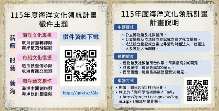 115年度海洋文化領航計畫徵件對象為各級學校、民間團體及博物館、社教館所,自即日起至115年2月25日止受理申請。今年度採線上申請方式,申請單位須至海洋委員會「海洋領域補助案入口網」(https://project.oac.gov.tw/Login.aspx)完成填報作業,並上傳相關計畫書及證明文件。今年度學校單位每案最高補助新臺幣100萬元,民間團體每案最高補助50萬元,公立博物館及社教館所每案合作經費最高為200萬元,期望透過各界參與,實現不同規模與型態的文化行動。