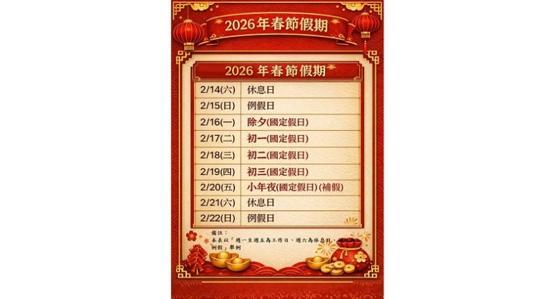 農曆新年將至,為了保障勞工休假權益並協助企業依法排班,臺北市勞動局特別提醒,在春節期間國定假日雇主與勞工朋友的給假給薪,以及出勤工資加給規定,呼籲雇主確實依法給假給薪、合理安排人力,讓勞工安心過年。