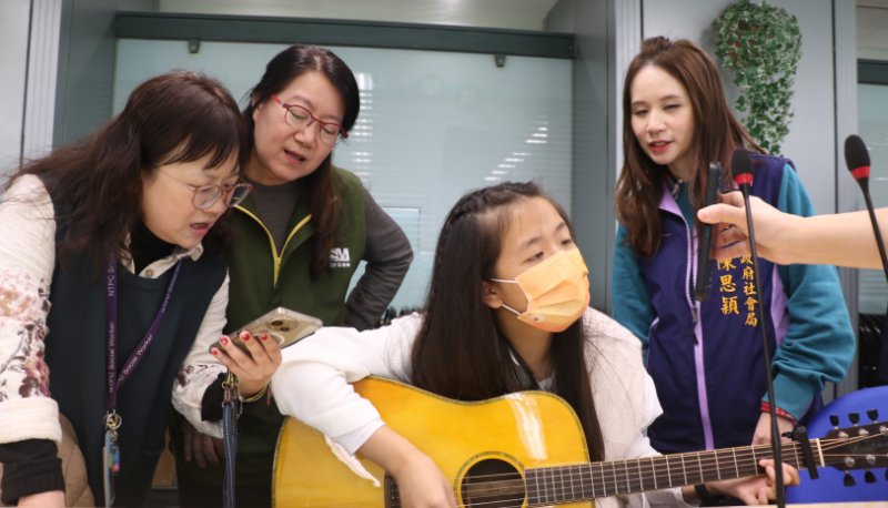 圖/小亭自彈自唱五月天的「知足」和「突然好想你」,希望藉由歌聲表達對所有幫助過的人的感謝。左2為安置機構院長蘇鈺惠。