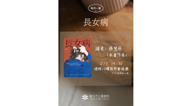 臺北市立圖書館2月份每月一書講座推薦圖書為《長女病:我們不是天生愛扛責任,台灣跨世代女兒的故事》,將邀請本書作者─張慧慈在2月7日(星期六)於總館10樓會議廳進行導讀分享。