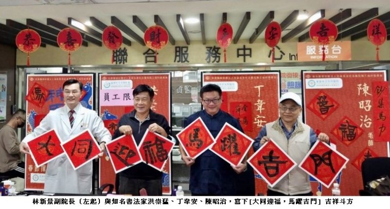 農曆春節將至,為營造濃厚年節氛圍並推廣傳統文化,高雄市立大同醫院今(4)日於一樓大廳舉辦「神馬都好賀新年 春聯贈送活動」,邀請知名書法家 洪崇猛老師、丁韋安老師、陳昭治老師現場揮毫,免費提供春聯與斗方,讓民眾及員工將馬年新春的好運與喜氣帶回家。