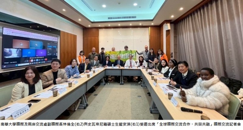 南華大學持續深化國際交流與大學社會責任(USR)實踐,並透過高教深耕計畫國際專章中的「Action Plan」,鼓勵國際生把在台灣所學的成果與經驗帶回母國分享與實踐。該校受邀參加1月27日及30日由台灣國際幸福家庭聯盟主辦的「全球國際交流合作・共榮共融」國際交流記者會及活動,由國際及兩岸交流處副國際長林倫全陪同企業管理學系管理科學碩士生史瓦帝尼籍藍安淇、馬拉威籍沐語彤,以及綠色永續科技碩士生坦尚尼亞籍麥可等三位學生出席活動,並分享返鄉的服務經驗及實踐成果,不僅展現南華大學培育全球人才及落實永續影響力之具體實踐,更是台灣與非洲教育合作的推動成果。