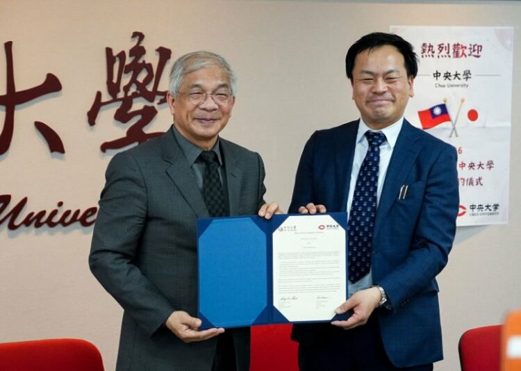 圖:世新大學校長陳清河(左)與日本中央大學國際中心松永伸也(右)交換姊妹校合作協議