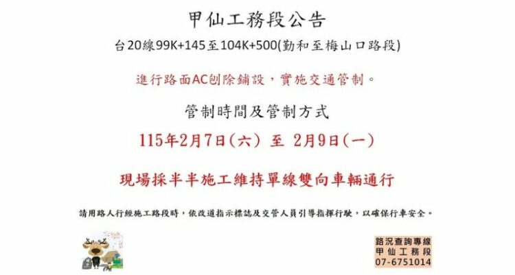 公路局南區養護工程分局甲仙工務段辦理台20線99K+145至104K+500(桃源勤和至梅山口路段)進行路面AC刨除鋪設,實施雙向交通管制,舖設時間自115年2月7日至115年2月9日止,上述路段採半半施工維持單線雙向車輛通行,請用路人行經施工路段時,依改道指示標誌及交管人員引導指揮行駛,以確保行車安全,請用路人行經該路段小心駕駛。