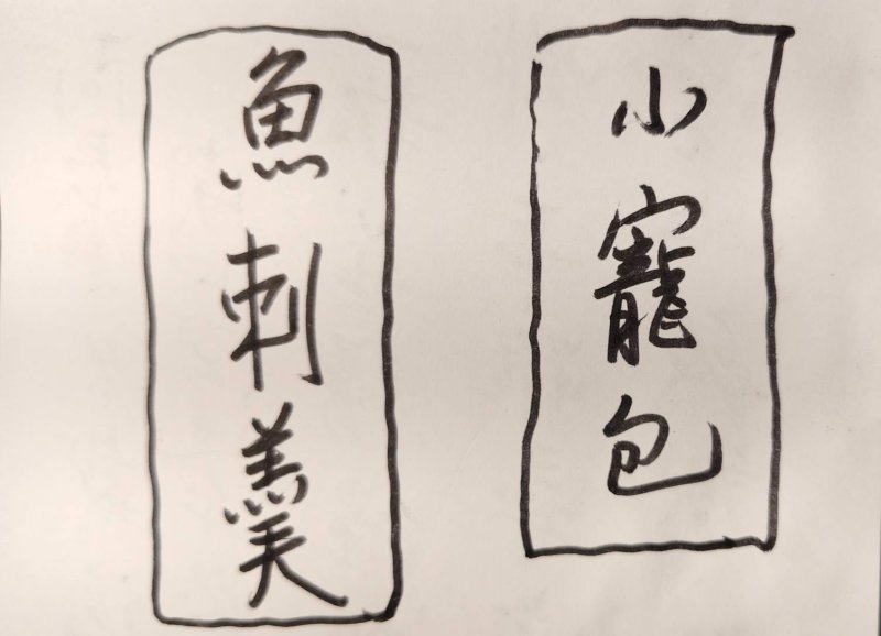 一家小攤販,賣小籠包。他寫「寵」包。問何以如此,他解釋,「蒸籠上面不是鍋蓋嗎?寵,沒有什麼錯啊。」屏東縣一家小店,賣魚翅羹,他們看板是「魚刺羹」,乍看嚇一跳,若是吞食,恐怕要送醫院急診。