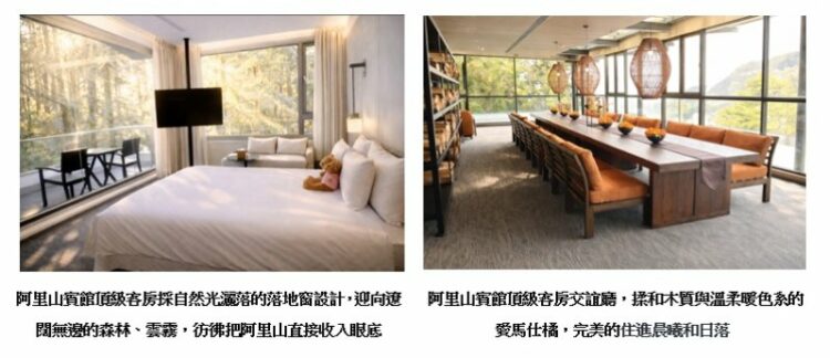 阿里山豐富的森林、自然生態、森林鐵道,屢登國際媒體讚譽,再加上森林療癒風行,成為許多民眾身心放鬆的絕佳場域。位於園區2,274公尺海拔至高點的阿里山賓館,整座飯店被山林環繞包圍著,蘊藏著絕美扁柏、杉林、雲海和日落、夕陽景色,無論從哪個角度都得以延攬山林美景。阿里山賓館王覺非總經理說,賓館耗時1年多投入昂貴的營建費用和高山建造不易的時間成本,全新打造再升級6間森林、雲霧的客房,採自然光灑落的落地窗設計,每間客房皆設置獨立式浴缸,讓杉柏生態直接映入眼簾,其中兩間客房特別設計獨立專屬陽台,直接迎向遼闊無邊的森林、雲霧、晨曦,彷彿把阿里山直接收入眼底!