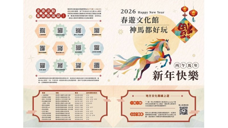 雲林縣政府為提供民眾走春好去處,2月14日至2月22日新春假期,文化場館聯合推出超過120場次的新春限定活動,歡迎闔家大小一起來春遊文化館,神「馬」都好玩!