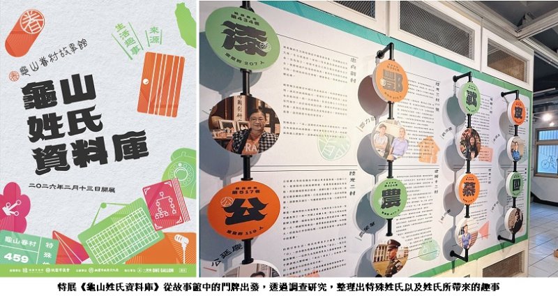 龜山眷村故事館於115年2月13日起推出主題特展《龜山姓氏資料庫》。以「姓氏」為核心,從館藏的眷戶門牌出發,梳理住戶遷徙、世代更迭與生命歷程所交織而成的眷村生活史,讓原本作為行政管理與尋人的實用標記,轉化為承載情感與記憶的重要媒介,帶領觀眾回望龜山眷村居民的居住變遷與家族記憶。