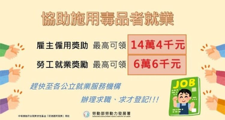 勞動部為協助曾施用毒品的待業民眾能夠重返職場順利就業,積極推動「施用毒品者就業服務計畫」,透過就業服務員提供職涯探索、就業前準備、陪同面試、開發友善廠商等多項服務措施,符合該計畫資格之求職者,每個月可以領取5,000元或6,000元不等的獎勵金,最長可以領取12個月;另外,為了鼓勵雇主提供友善的就業機會,僱用經公立就業服務機構推介的施用毒品者滿10天,即可申領津貼,累計最高可申領14萬4,000元。