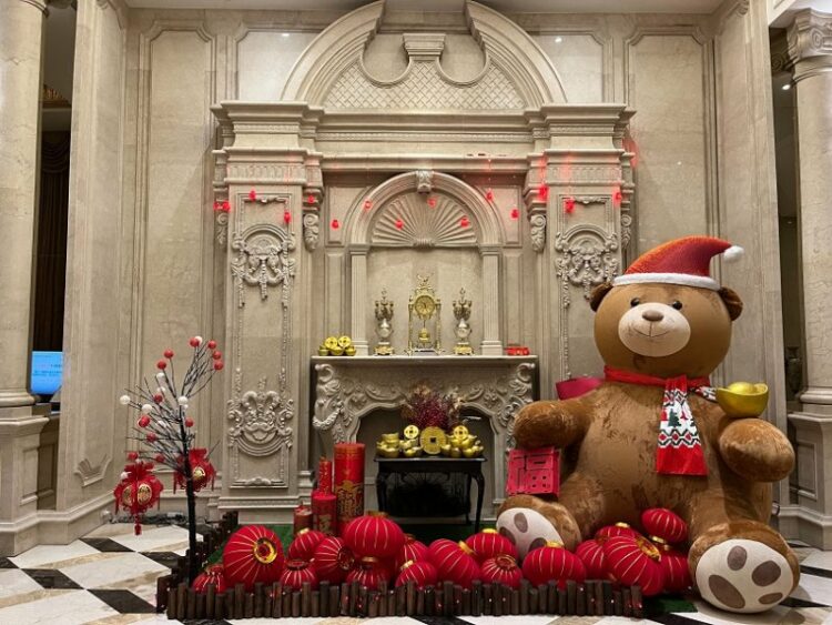 圖/溫莎堡穿堂壁爐前熊寶寶玩偶置身在金玉滿堂庭院