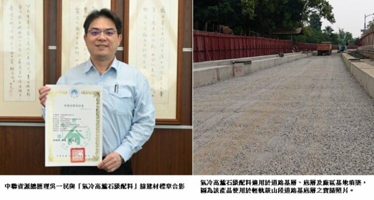 中聯資源總經理吳一民表示,推廣氣冷高爐石級配料不僅可提升鋼鐵副產物的工程價值,亦有助紓解天然砂石短缺,實踐企業 ESG 責任。另外,中聯資源截至目前已取得包括「高爐爐碴水泥」、「瀝青鋪面用粒料」及「道路基底層級配料」、「氣冷高爐石級配料」等產品共十張綠建材標章,未來將持續投入再生建材研發,藉由品質提升推動綠建材於公共工程與民間建設的廣泛應用,為台灣環境永續與循環經濟注入動能。