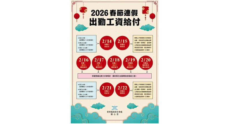 縣府將持續透過多元宣導管道,協助事業單位與勞工朋友正確認識假別及工資規定,並適時提供諮詢與輔導服務。如對春節出勤安排、補假方式或工資給付計算仍有疑問,請於上班時間歡迎洽詢臺東縣政府社會處勞工行政諮詢專線(089-351834),由專人提供說明與協助,共同維護勞資雙方權益,營造安心、合法、和諧的勞動環境。