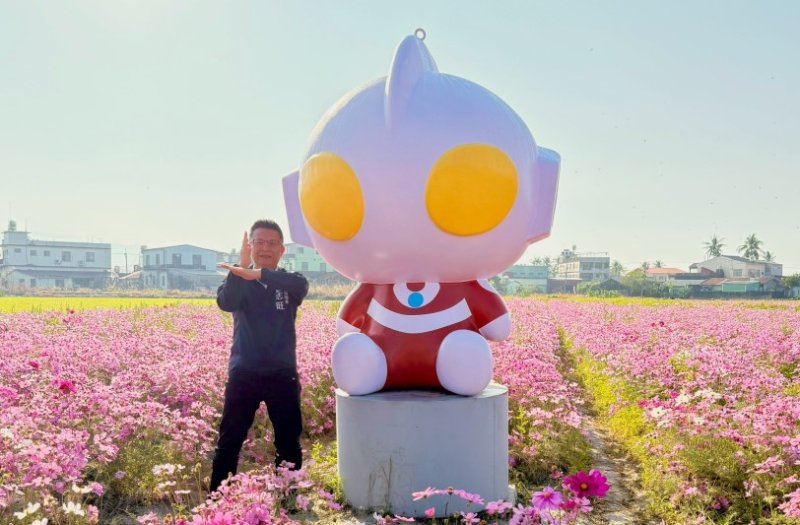 圖/美濃花區大波斯菊盛開,配合「2026 Kaohsiung Wonderland 高雄冬日遊樂園」主題,美濃花區由經典的「初代超人力霸王」坐鎮守護守護繽紛的花海大地,高雄市政府農業局長姚志旺(右圖)歡迎大家走進農村,感受花海綻放的生命力與高雄農村的美好