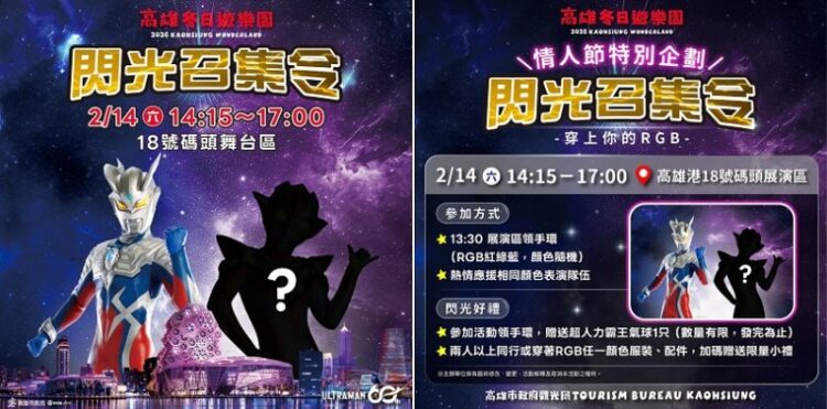高雄市政府觀光局「2026 Kaohsiung Wonderland 高雄冬日遊樂園」以經典英雄「超人力霸王」守護港都,開幕以來掀起全台熱潮!適逢2月14日西洋情人節,重磅推出「閃光召集令」快閃活動,下午2時至5時在高雄港18號碼頭展演區盛大登場。活動不僅有RGB「光之三原色」紅、綠、藍主題應援,而活動除了已公布的超人力霸王「初代v.s達達」迷你秀全台首演外,還特別安排隱藏版神秘嘉賓到場,觀光局邀請民眾2/14來活動現場,一同以「光之集結」與「閃光放閃」召喚超人力霸王神秘嘉賓現身。