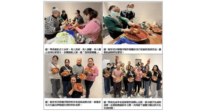 在實作過程中, 學員們彼此分工合作,有人洗菜、有人調醬、有人細心塗抹白菜葉片,彷彿提前上演一場「泡菜版圍爐」。一邊製作、一邊分享各自的過年習俗與家鄉故事,現場充滿笑聲與溫暖氣氛。有學員笑著說,這次活動就像提前準備年菜,不只是學做料理,更是在為家人準備一份心意與祝福,讓跨文化交流在互動中自然發酵。