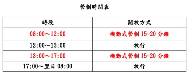 1.每周一至周日管制通行時段以外,其餘時段皆開放通行。行經此路段時請依照現場指揮通行。