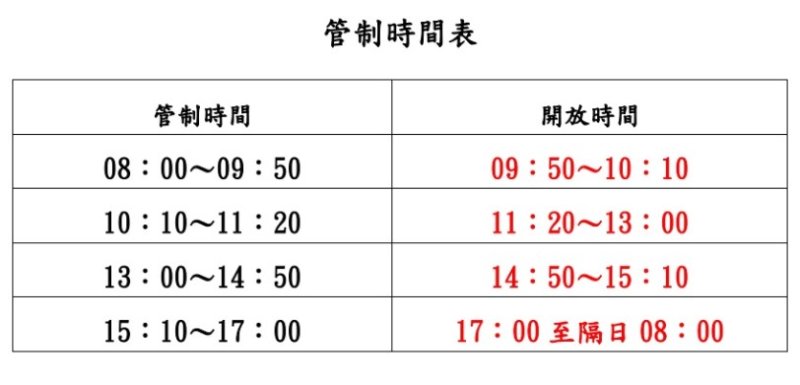 1.管制時間以外,其餘時段皆開放通行,其中週五及週日15:00以後不管制,行經此路段時請依照現場指揮通行。