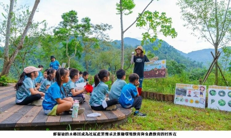 秀峰村坐落於清水溪河階地,早年稻作產業興盛,曾為鹿谷地區產值最高的村落之一。秀峰村村長曾文香提到,社區自2021年起,逐步梳理文史脈絡並投入里山計畫,近年再透過農村再生支持,共同修復水梯田、重新引入水源灌溉,打造人情味滿滿的環境教育場域。搭配社區巡守隊自主維護管理,今日的水梯田不只成為當地秀峰國小全新戶外教室,也成為學童最自然的遊戲場,更是社區三代居民共享、共學、共好的好所在!