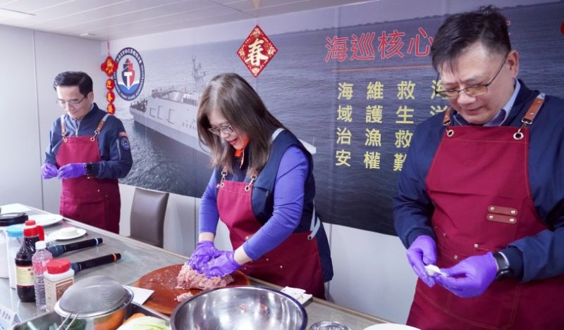 繼龍年春節前到桃園二三岸巡隊烹飪紅燒獅子頭、蛇年到新北第二一岸巡中隊製作黃金蛋捲,為了慰勞全年無休堅守崗位的海巡同仁,管碧玲主委馬年擴大陣容,率海巡署長張忠龍、艦隊分署長黃宣凱,全副圍裙、帽套親手料理清燉獅子頭、炸年糕與水餃,為年節期間仍需值勤的長濱艦同仁準備年菜,這也是管碧玲連續三年親赴海巡基層廚房、為海巡同仁圍爐備餐,溫馨有趣的過程也讓長濱艦充滿年味。