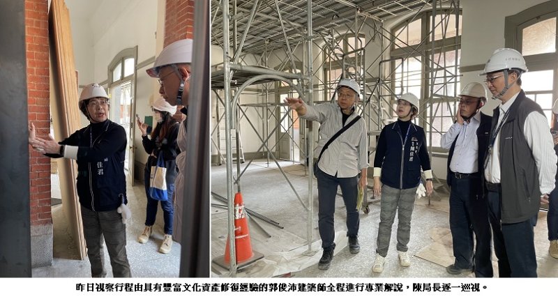 昨日視察行程由具有豐富文化資產修復經驗的郭俊沛建築師全程進行專業解說,陳局長逐一巡視內部裝修、景觀工程及機電消防系統的施作現況及施工細節,並要求春節期間更要特別落實工地安全管理,以守護這座國定古蹟的安全。陳局長於現場特別勉勵施工團隊,再利用工程已進入關鍵階段,必須在嚴守工安前提下,落實工程細節品質。
