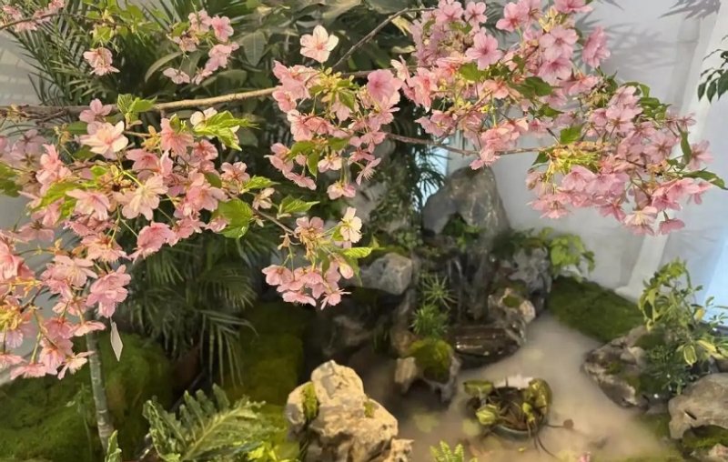 櫻花被安置於溫室棚中展示,遊客拉開棚門拉鏈步入後,一股陌生又略帶怪異的濃郁香氣撲鼻而來。棚內擺放兩株白色單瓣盆栽櫻花,其中較高的一株約兩公尺,強烈氣味正是來自這兩株花朵。
