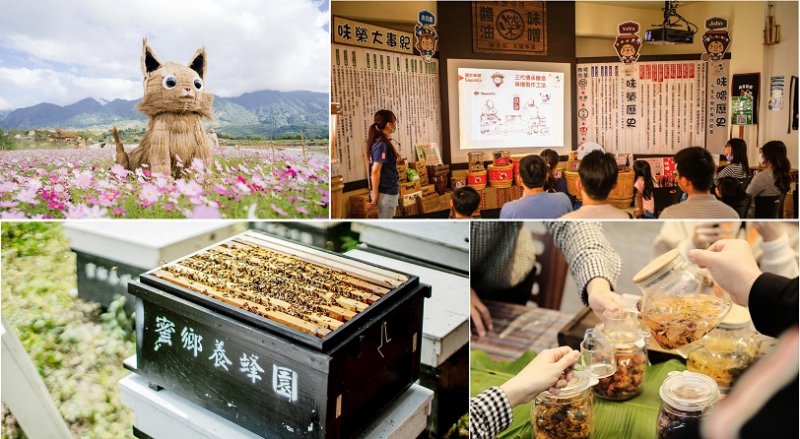圖/富里喵樂園集結超過20隻稻草貓咪!由學校組、社區組齊心創作,打造最萌打卡點。過年走春來花蓮富里,和喵星人們拍好拍滿!花蓮縣富里鄉農會提供(左上)、「台灣味噌釀造文化館」是充滿人文特色的焦點觀光工廠,提供豐富的五感體驗,更有手工味噌DIY、風味醬油DIY、美味飯糰手作等活動,深度探索台灣釀造文化。農遊超市提供(右上)、走訪蜜鄉養蜂園蜜蜂體驗活動,帶您深入認識蜜蜂生態,了解蜂產品從產地到餐桌的旅程。農遊超市提供(左下)、春節期間搶先逛金盞花季!到那羅灣休閒農業區杉沐松農場探索泰雅文化,雙手採摘香草、鼻尖嗅吸芬芳、親手萃取精油,還能品味部落美食饗宴。(右下)