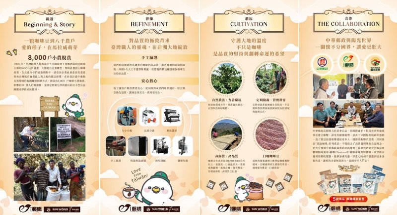 品牌創辦人施鴻森回顧,2008年因緣際會參與由歐盟主導的NGO扶貧計畫,毅然投入咖啡產業轉型,協助約8000戶咖啡小農改善生計,帶動近10萬人經濟圈發展。2018年創立「陽光世界」品牌後,更將公益理念制度化,固定提撥20%淨利捐助中小型公益團體及校園社區,其善行亦獲肯定,包括榮獲2021年中華民國海華獎章,以及2025年奧地利史懷哲國際基金會頒發的世界人類貢獻大十字勳章。
