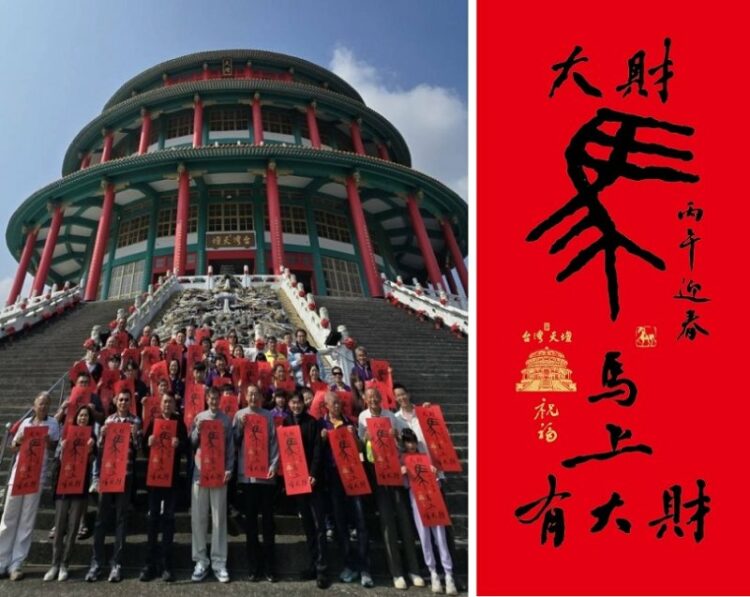 圖左:台灣天壇丙午初一迎春祈福典禮後合影。前排左2為台灣天壇慈和會會長梁羽彤,左5為台灣天壇主委謝豐如,右5為總幹事呂庭均(阿魯秘),與信眾手持經天公爐加持之〈馬上有大財〉春聯合影,共賀新歲吉祥。圖右:丙午迎春,天公爐加持〈馬上有大財〉。厚實大篆(大賺)之馬,上置「大財」構成直觀祝福意象;右題「丙午迎春」,寓新歲吉慶。願信眾財隨人走、福向家來,行穩致遠、歲歲有成。