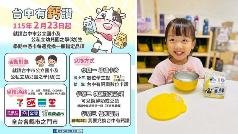 中央國產可溯源乳品政策停辦後,台中市政府主動接棒,推出「寶貝咱ㄟ囝仔-台中有鈣讚計畫」,自 114 學年度第 2 學期(115 年 2 月 23 日)起正式啟動。此計畫投入 2.7 億元經費,提供全市公立國小及公私立幼兒園約 24 萬名學童,學期中每週可持數位學生證或數位卡證至指定通路兌領 1 瓶鮮奶;針對乳糖不耐症需求,市府更貼心提供豆漿作為替代選項,透過便利的數位化流程與友善選擇,守護孩子成長營養不打折。