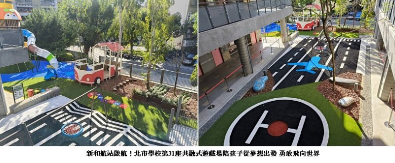 教育局表示114年度挹注1,440萬元在碧湖國小、南門國小及新和國小設置共融式遊戲場,近3年來挹注4,800萬元經費在10所學校設置校園共融式遊戲場,115年度更將投入2,400萬元經費增加5所國小設置校園共融式遊戲場。臺北市新和國小打造結合國際教育與在地文化的共融學習新地標,並於試營運後開放「新和航站」供社區民眾使用,誠摯邀請親子走進校園,在共融學習空間中一起玩、一起學、一起成長,陪伴孩子勇敢追夢、飛向世界。