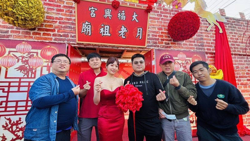 大福興宮月老祖廟古禮拋繡球,徵友徵婚隆重登場,今年報名人數是往年2倍,擠滿未婚男女青年及親友團,各優質女子依序上台拋繡球,知名女網紅柯莉絲汀一襲經典大紅露肩禮服,洋溢喜氣與熱情驚艷全場。