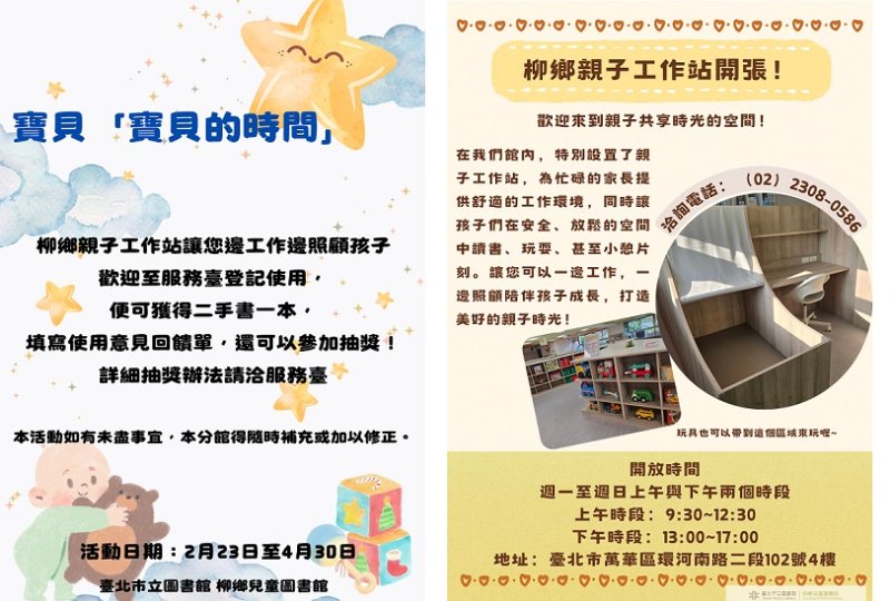 為回應現代家庭育兒與工作需兼顧的情況,柳鄉兒童圖書館特別設置親子友善空間「親子工作站」,提供家長與幼童一同使用的舒適環境,打造兼顧育兒與自我需求的友善空間。為此柳鄉兒童圖書館將於2月23日推出「寶貝『寶貝的時間』」親子工作站體驗活動,邀請家長帶著幼童一起來體驗專為親子設計的親子工作站。