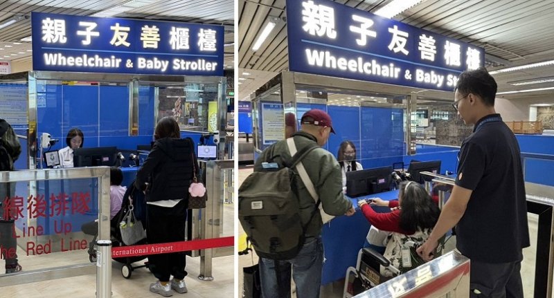 圖左/高雄機場入境娃娃車旅客使用「親子友善櫃檯」。圖右/高雄機場入境輪椅旅客使用「親子友善櫃檯」