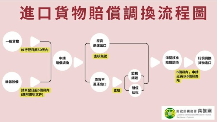 高雄關進一步說明,依關稅法第51條及同法施行細則第40至42條規定,進口貨物有損壞或規格、品質與原訂合約規定不符,進口人應於原貨物放行之翌日起1個月內,機器設備則得於安裝就緒試車之翌日起3個月內,檢具申請書並備原訂合約及有關來往文件(如發票、賠償協議、公證報告等證明文件)向海關申請核辦,日後報運進口之賠償調換貨物方可免稅。若原貨物經國外供應商聲明放棄無須復運出口,進口人仍須將原貨送海關或申請海關派員至該貨存儲地查驗,如其尚有剩餘價值者,應重行估價徵稅,日後進口之賠償調換貨物始可適用上開免稅規定。