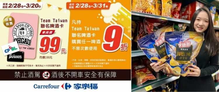 再一波金色補給泉水,加碼家樂福會員專屬「家樂福x Team Taiwan聯名啤酒卡」會員價只要99元(市價199元),三款限量卡面隨機販售,2月28日~3月20日啤酒卡限量販售,3月31日前不限使用次數,購買啤酒結帳出示啤酒卡享9折優惠,包含檔期推薦啤酒也適用。(此啤酒卡不適用大宗採購,且不含:出清、預購、特別促銷活動  商品、臺灣菸酒公賣局商品)