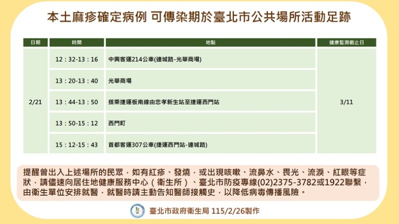 新北市新增1例麻疹本土確定病例,經衛生單位疫調,確診個案於可傳染期間曾於2月21日中午12時32分至下午1時16分搭乘中興客運214公車自連城路至光華商場站,下午1時20分至1時40分於光華商場購物,於1時44分至1時50分搭乘捷運板南線自忠孝新生站至西門站,並在西門町逛街至下午3時許,下午3時12分至3時43分搭乘首都客運307公車返家,臺北市政府衛生局表示相關場域及搭乘過的捷運與公車均已加強清消,提醒曾經與確診者足跡重疊者,請自主健康監測18天。