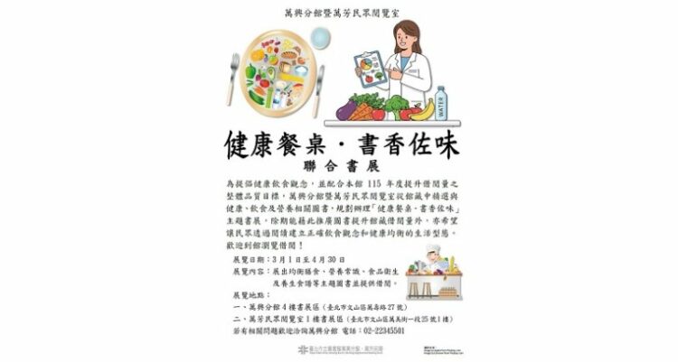 為提升民眾健康飲食觀念並活化館藏資源,臺北市立圖書館萬興分館暨萬芳民眾閱覽室,自3月1日起推出「健康餐桌.書香佐味」主題書展,精選健康、飲食與營養相關書籍,邀請民眾透過閱讀建立正確飲食觀念,為自己與家人健康把關。