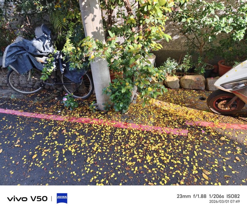 波新聞-戴貴立/屏東米老鼠這種植物,花有紅黃兩色,最近盛開,一地都是鮮黃。樹下擺放機車,車燈及前面擋風板,落滿黃花,車主一時興起,在臉書上發表:落英繽紛機車美, 踏花歸去馬蹄香,橫批,胡湊亂套總是詩。不算工整,但是沒有大錯。