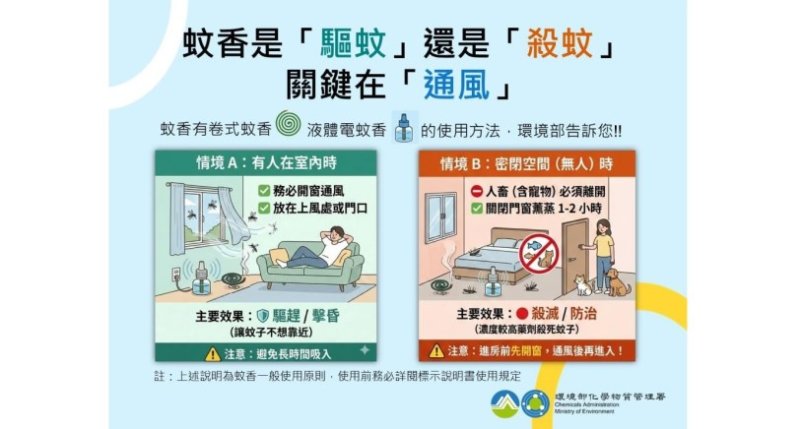 天氣轉熱,蚊蟲擾人,許多民眾習慣使用蚊香來換取一夜好眠,並以為用了蚊香就能將蚊子全數殺光。環境部提醒,常見蚊香有液體電蚊香、卷式蚊香二種,主要成分多為除蟲菊精類,效果取決於使用環境的「通風程度」與「密閉與否」,民眾應掌握「人若在室內要通風」、「人畜離開才密閉」的正確觀念,才能安全又有效。