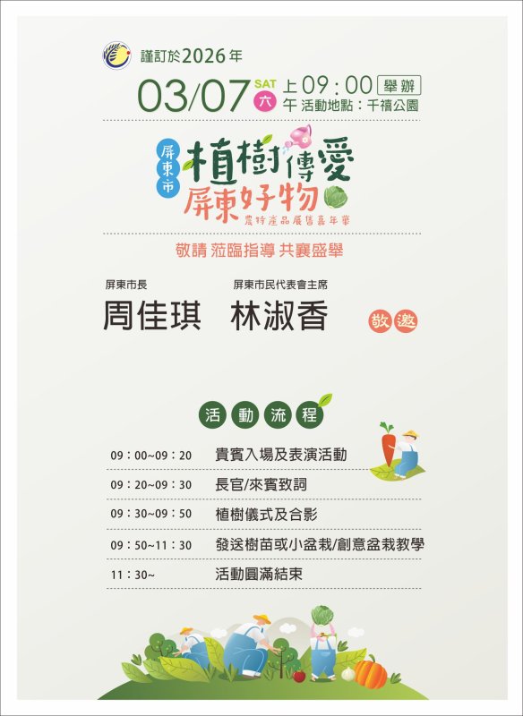 屏東市公所將於3月7日(六)上午9點至中午11點30分,在千禧公園中央圓型廣場舉辦「植樹傳愛 ‧ 屏東好物」植樹節活動,公所團隊熱情號召市民積極加入植樹行列,落實植樹及護樹行動,以提升城市的綠覆率,進而淨化空氣品質、降低城市溫度,並且透過活動深化對植樹重要性的觀念,從而推動地球永續發展認知的建立。