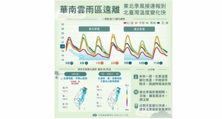 未來天氣方面,週六、週日清晨東北季風影響,北台灣天氣較涼,其他地區早晚亦涼,週日白天起東北季風減弱,北台灣氣溫稍回升;基隆北海岸、東半部地區、恆春半島及大台北山區有局部短暫雨,其他地區為多雲到晴,週六大台北地區亦有零星短暫雨。