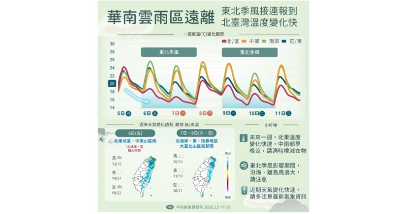 下週三東北季風減弱,北台灣氣溫回升,早晚天氣仍較涼,基隆北海岸、東半部地區、恆春半島有局部短暫雨,桃園以北地區及其他山區有零星短暫雨,其他地區為多雲到晴。